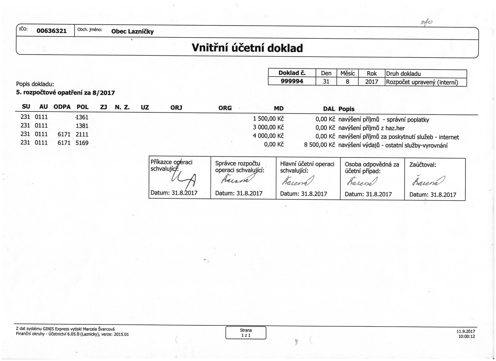 Úvod > Úřad obce > Dokumenty z obce > Rozpočet a finanční dokumenty > Rozpočtová opatření 2017